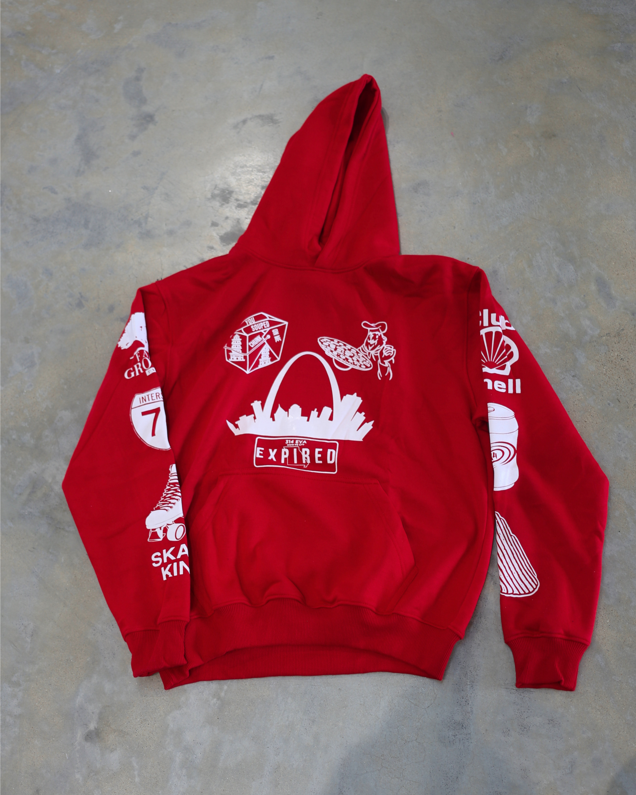 Heavyweight red hoodie featuring bold St. Louis inspired graphics in a clean, high-contrast print.